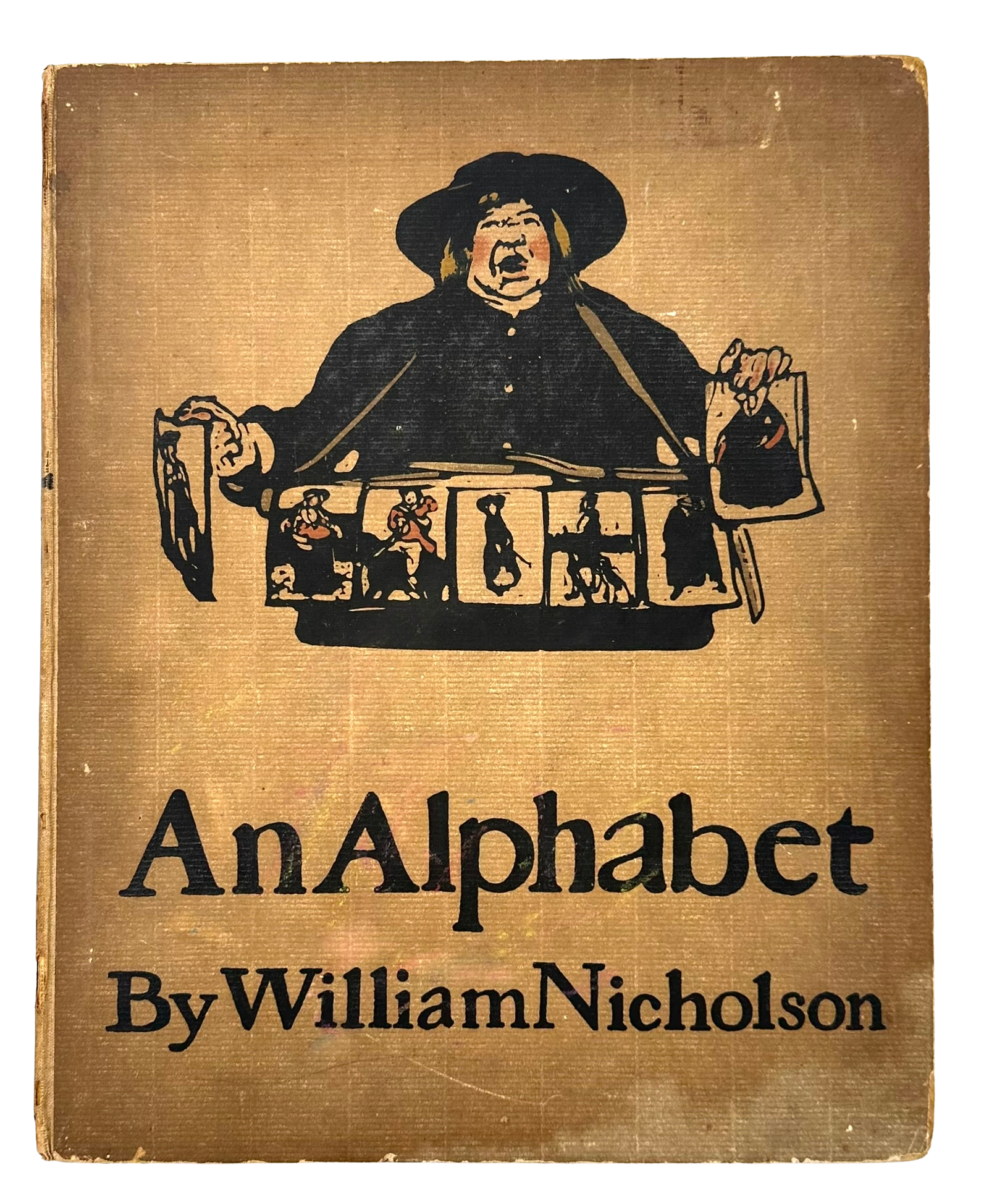 Before he became a well-known painter, William Nicholson was a pioneer of pictorial advertisement and poster design. This was the first of 5 lithographic books he would produce for William Heinemann. The images in this work, as with much of his earlier poster work, are characterised by bold silhouettes and flat colours. The opening image ‘A was an Artist’ is thought to be a self-portrait. Nicholson famously taught painting to Winston Churchill in the 1030s.