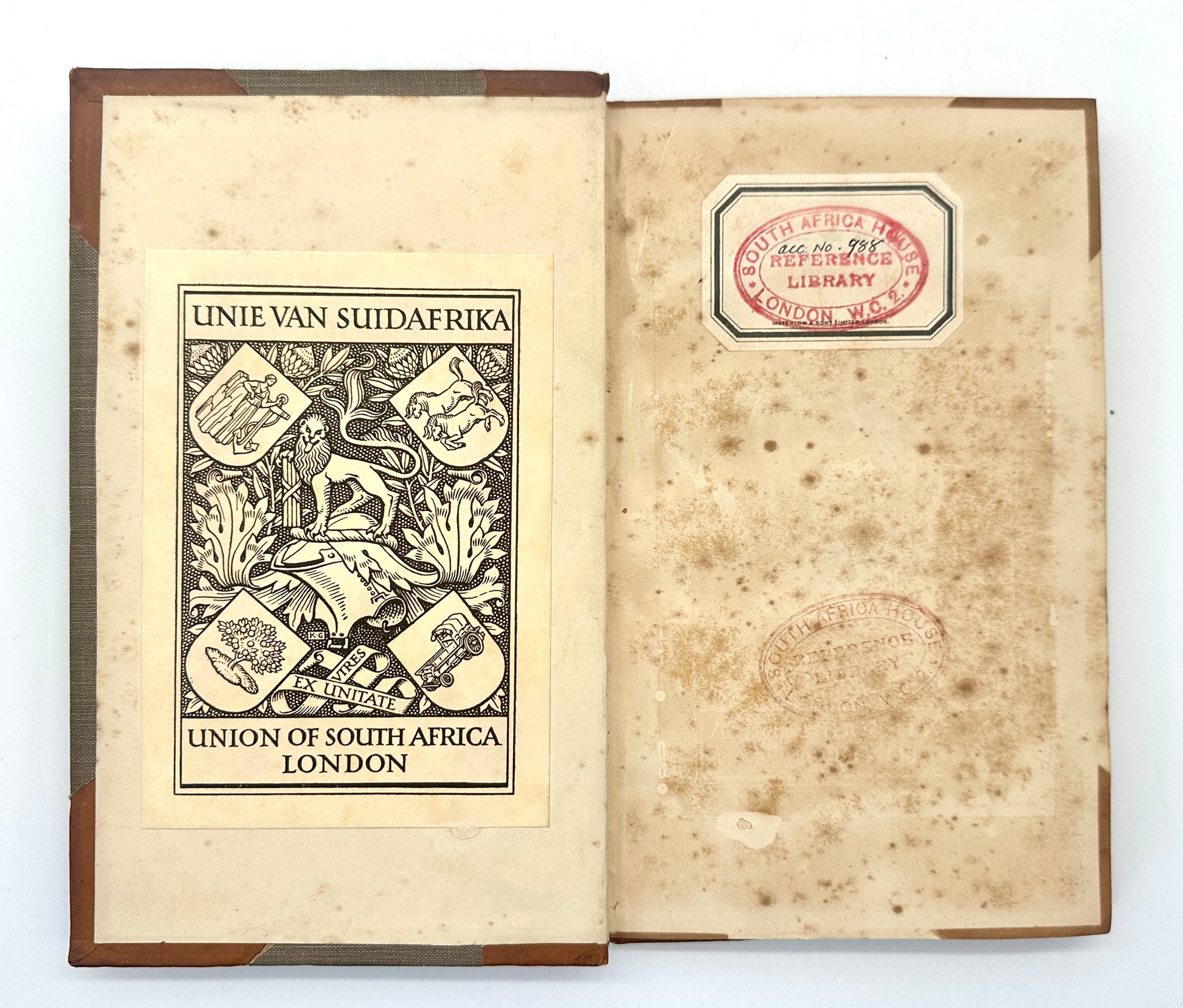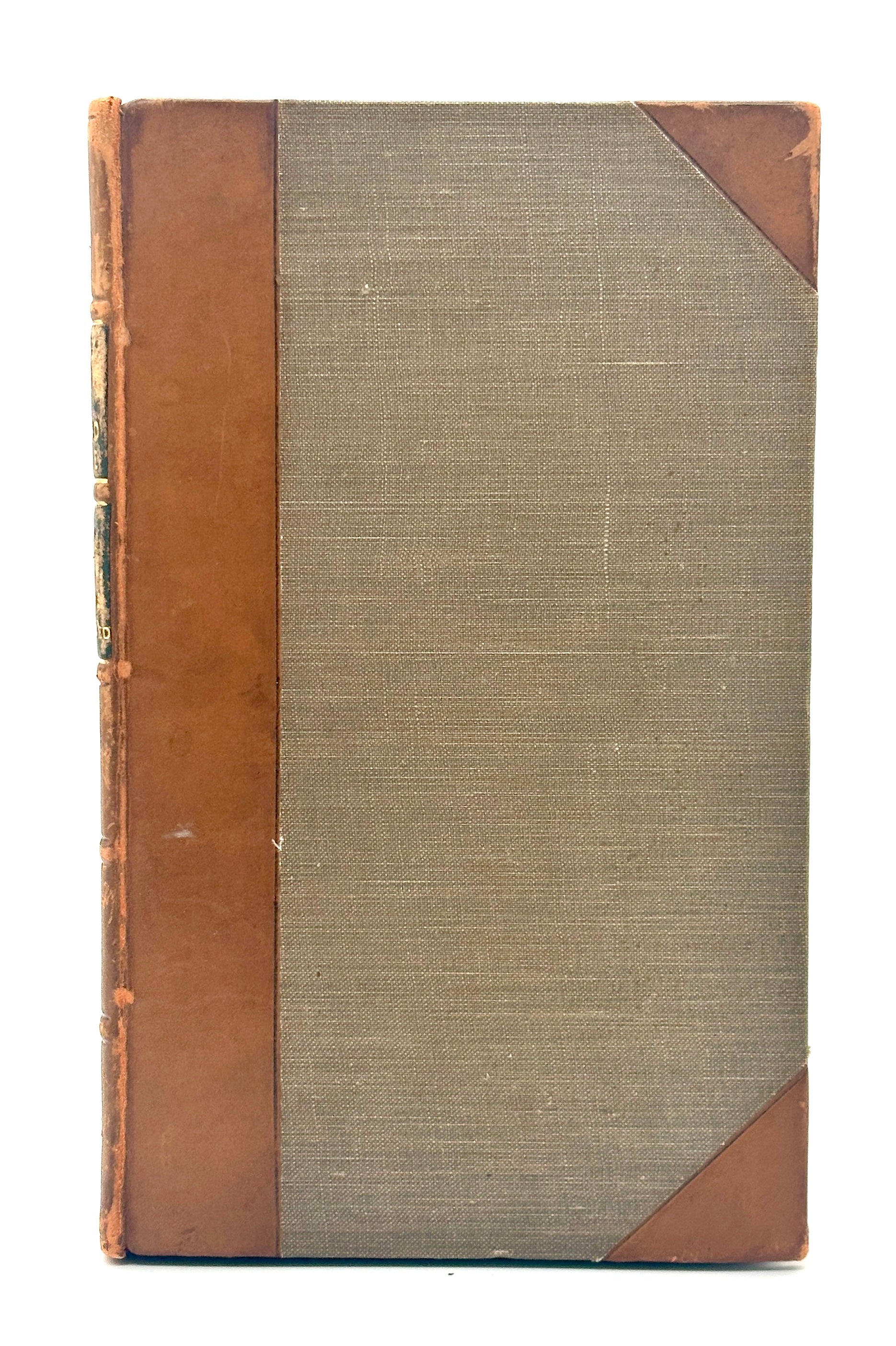 Half leather over gray cloth boards. 5 Raised bands to spine, gilt titles to compartment labels, date stamped in gilt to foot of spine. Ex-library: South Africa House, London and Library of Parliament, Cape Town, with stamps to blank prelims. Ex-libris (Library of Parliament?) to front paste-down.