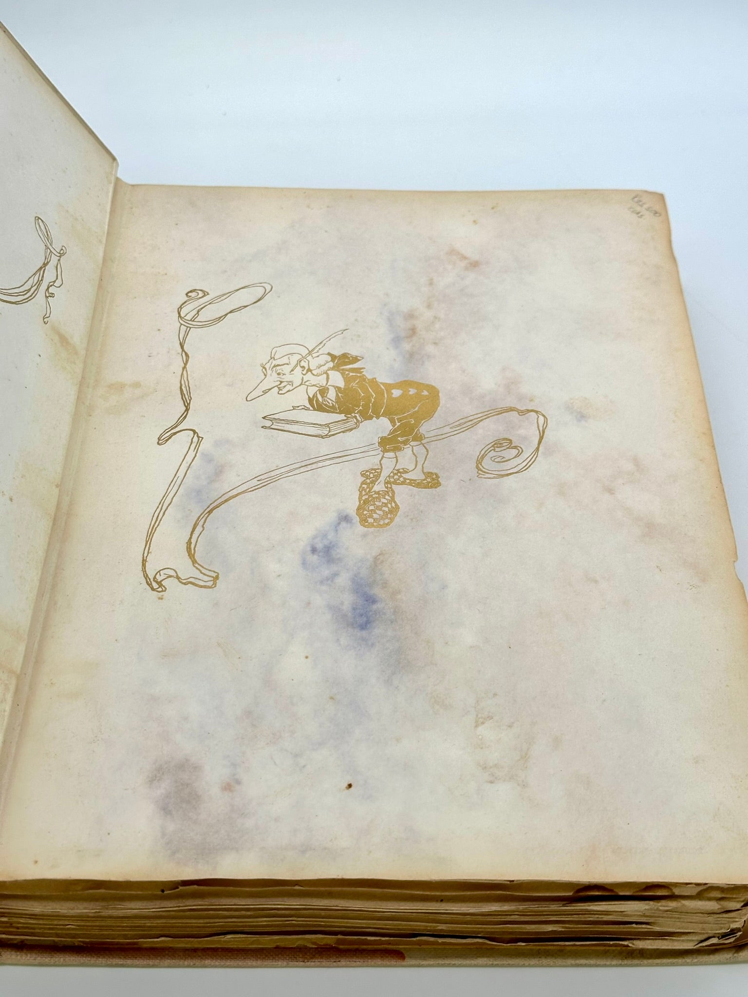 White buckram boards with gilt titles and publisher’s device to top board; gilt titles to spine. Original red ribbons, slightly frayed, lower ribbons partially detached. Top edge gilt, other edges untrimmed. Large paper edition, with colour frontispiece, 12 additional colour plates and numerous b/w in text illustrations by Rackham.