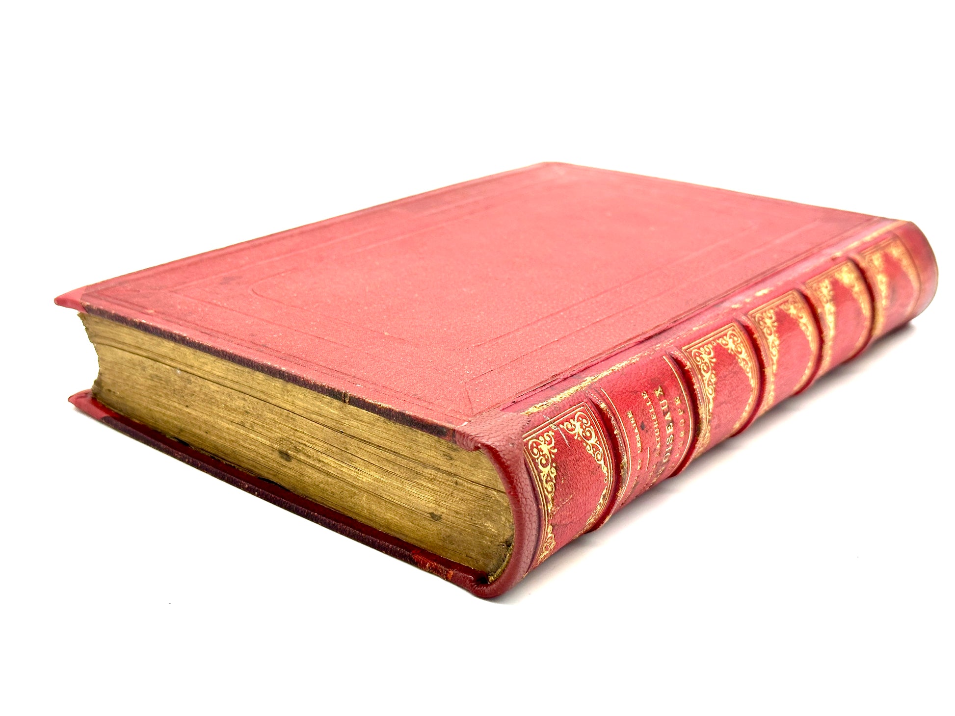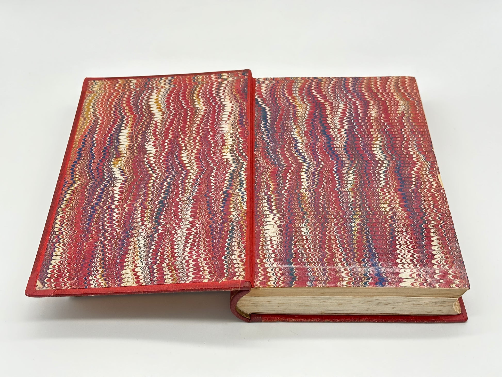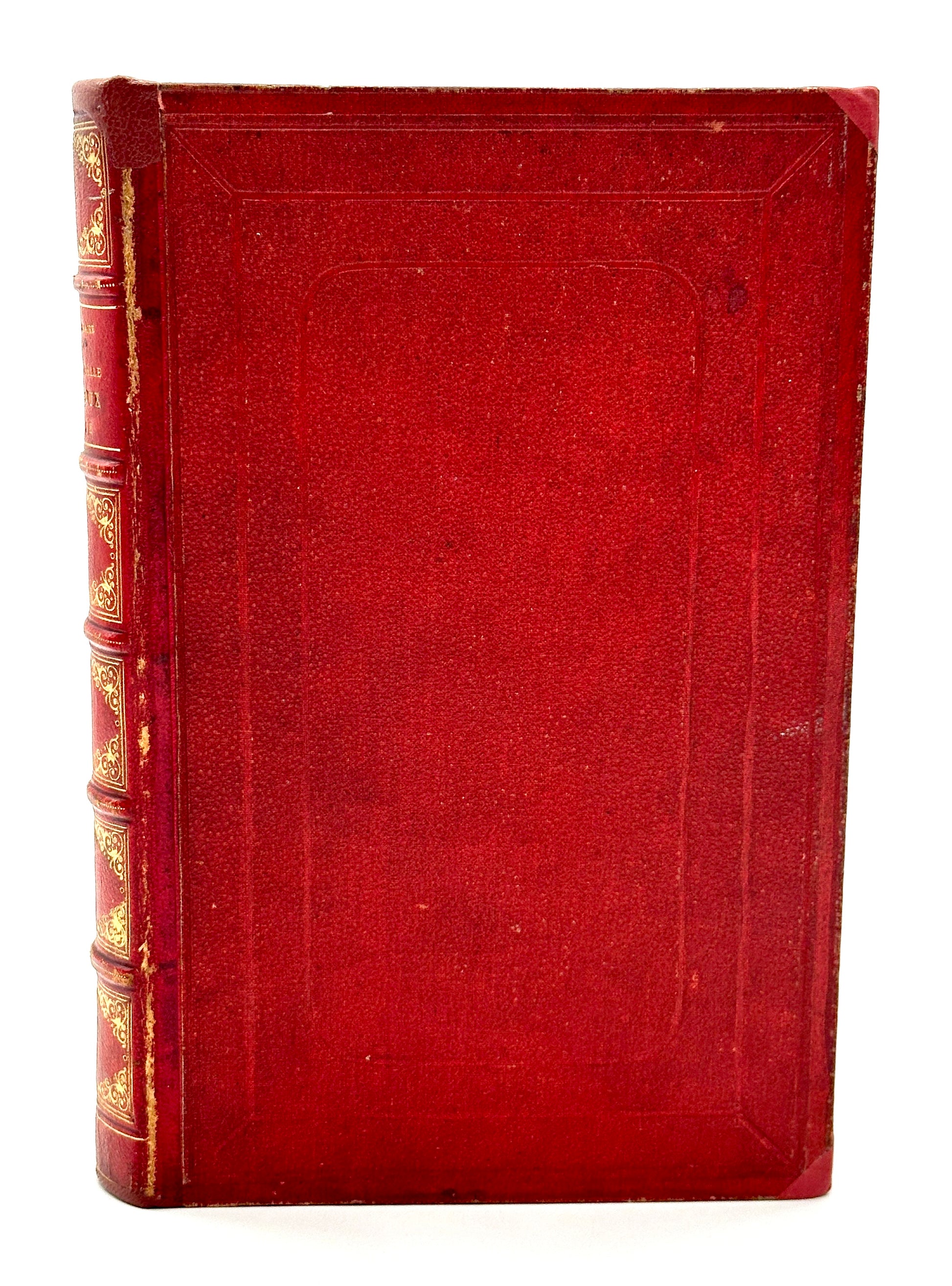 Marbled endpapers. Rebacked, with leather spine, 5 raised bands, ornate tooling and titles in gilt - red, pebbled cloth boards with blind tooling. Top edge gilt. Head and tailcaps rebuilt, reinforced cloth corners, many tissue guards appear to be later additions (older guards foxed and browned).