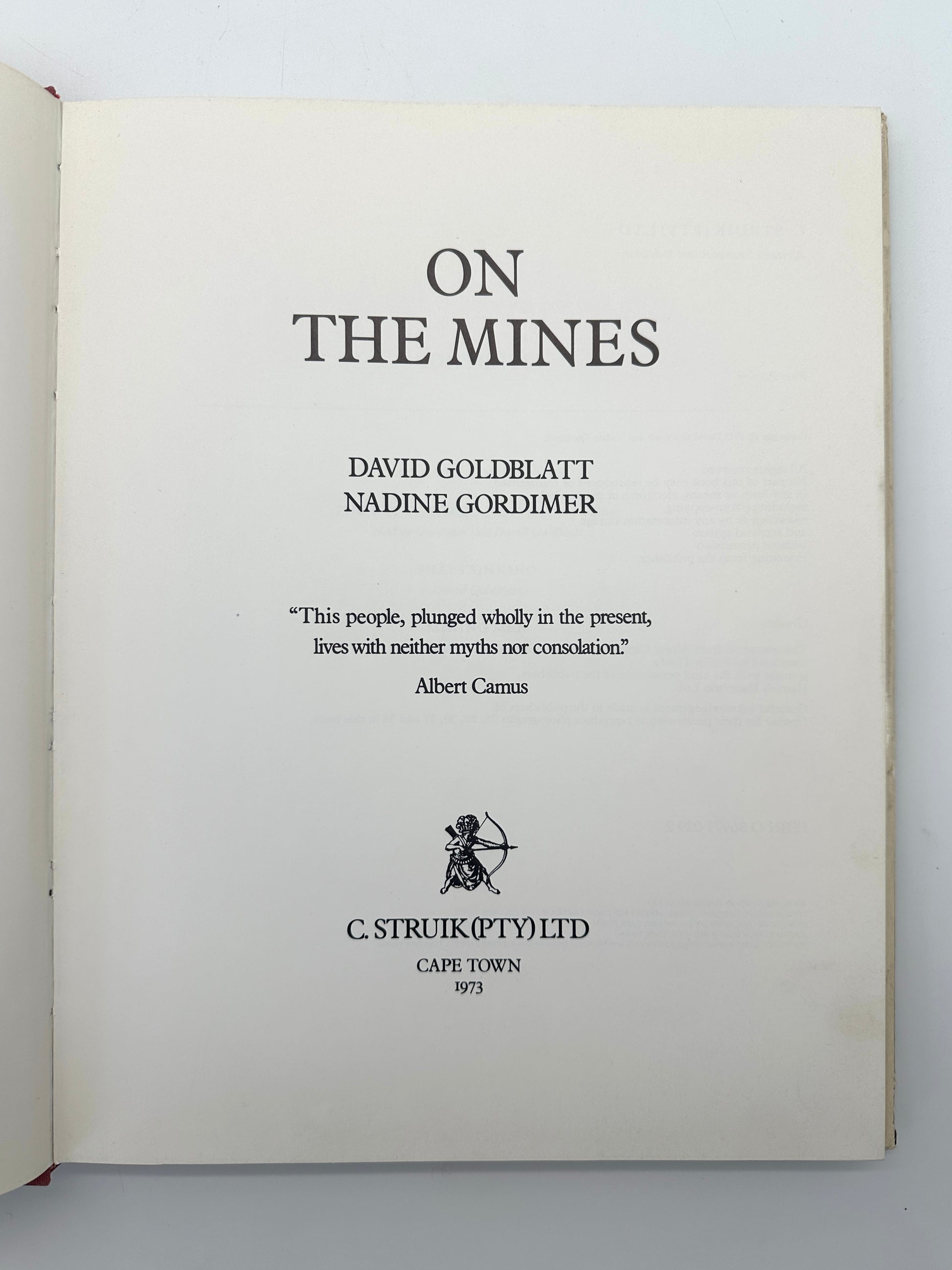 Burgundy cloth boards, gilt titles to spine. Signed and inscribed to Tom Ernst by Goldblatt to the half title and dated March 1975. 7 page introductory essay by South African Nobel laureate Nadine Gordimer, followed by Hasselblat award winning photographer Goldblatt’s haunting images of the mines and miners of the Witwatersrand. On the Mines was Goldblatt’s first photobook.