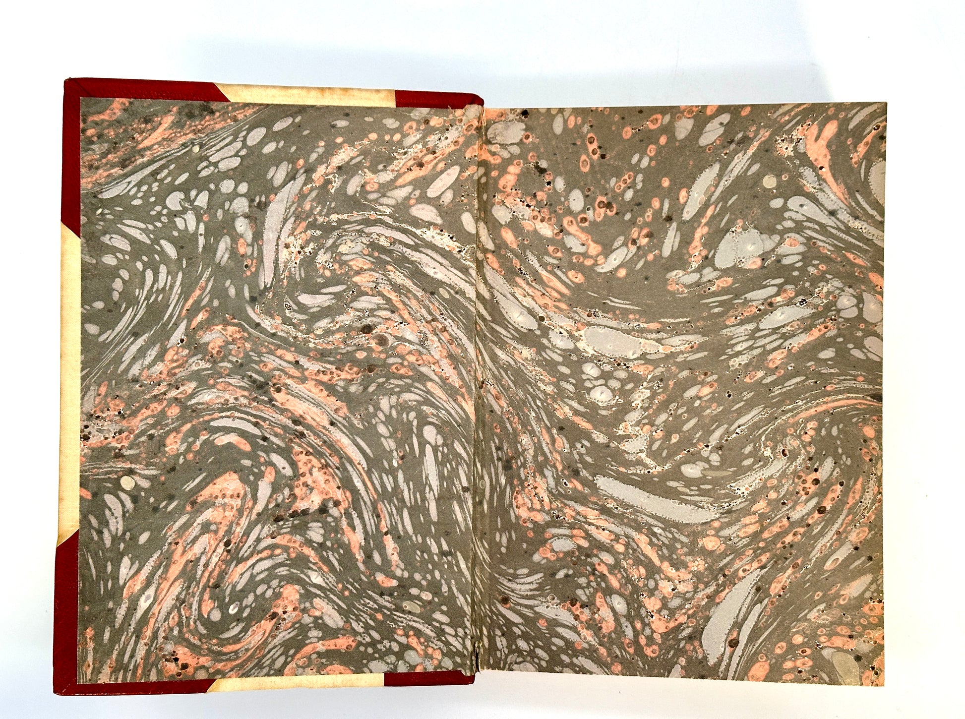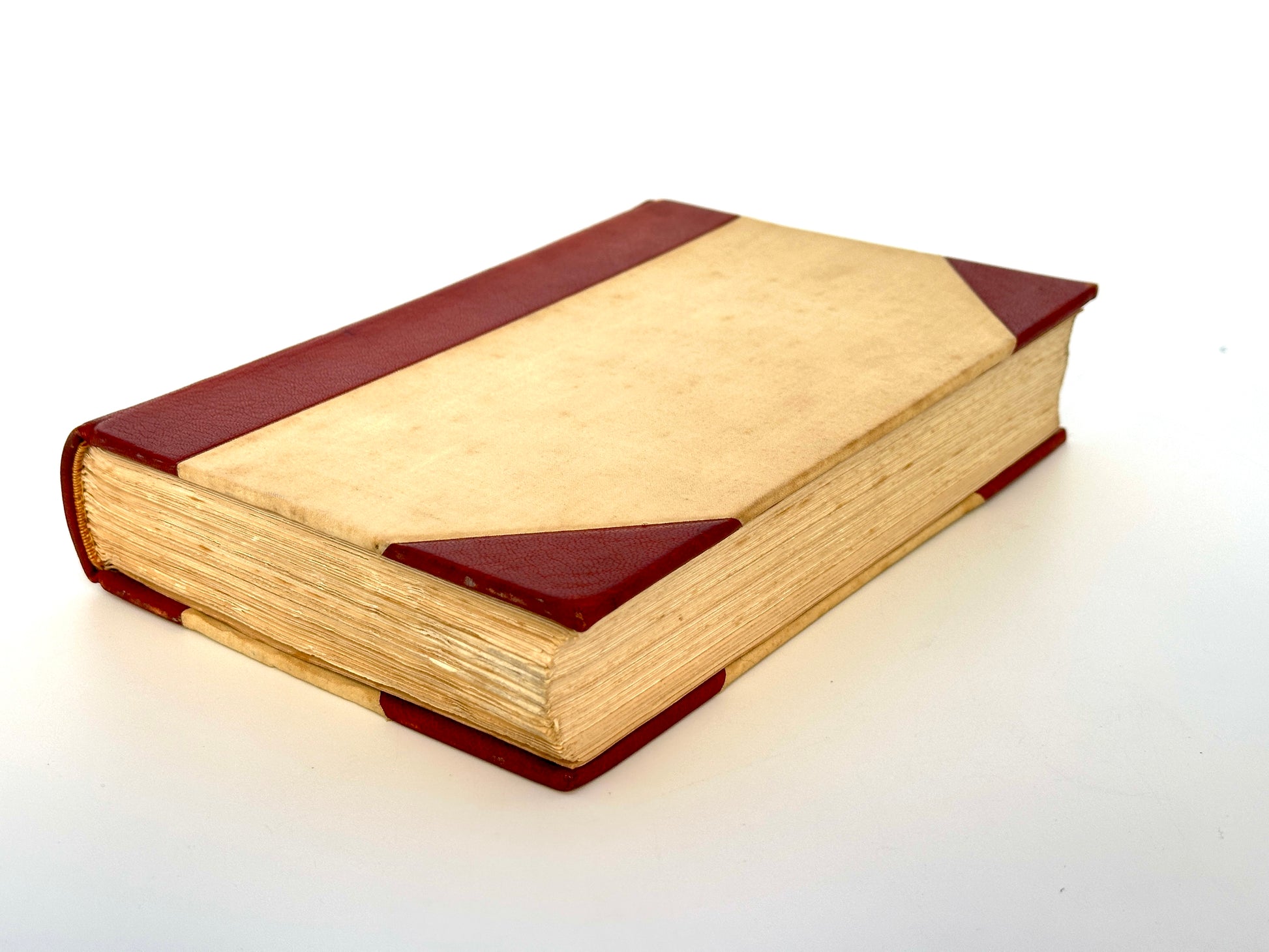 Signed, deluxe edition, bound in half red morocco over cream boards. 5 Raised bands to spine, gilt and black rules, titles stamped in gilt. Marbled endpapers. Top edge gilt, tail edge untrimmed.