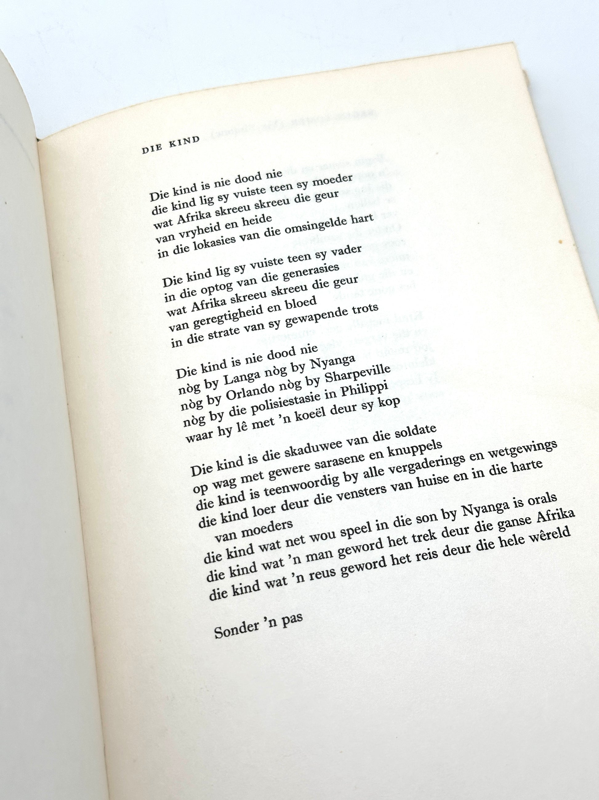 Contains arguably the poet’s most famous poem “Die Kind” (The Child) which was read by Nelson Mandela, during his address at the opening of the first democratic parliament of South Africa on May 24, 1994.